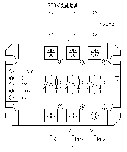 2、  三相交流電路的進線R、ST無相序要求,導(dǎo)線粗細按實際使用電流選擇。U、V、W輸出端可接380VacY形電加熱負載(N線不接)。