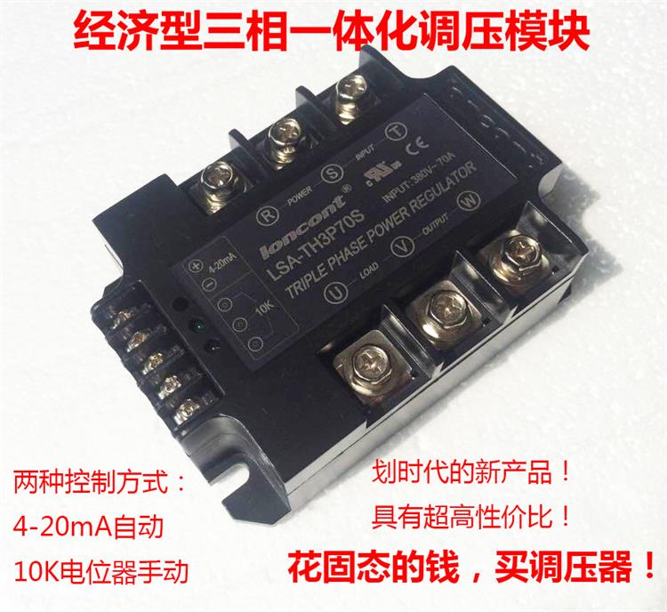 1、龍科LSA-系列經(jīng)濟型三相調(diào)壓模塊采用進口大規(guī)模集成電路設(shè)計,內(nèi)部集三相移相觸發(fā)電路、單向可控硅、RC阻容吸收回路及電源電路等于一體,4-20mA輸入控制或者10K電位器作用下,產(chǎn)生三相可改變導(dǎo)通角的強觸發(fā)脈沖信號再去分別控制內(nèi)部可控硅,實現(xiàn)三相負載電壓從0V到電網(wǎng)全電壓的無級可調(diào)。