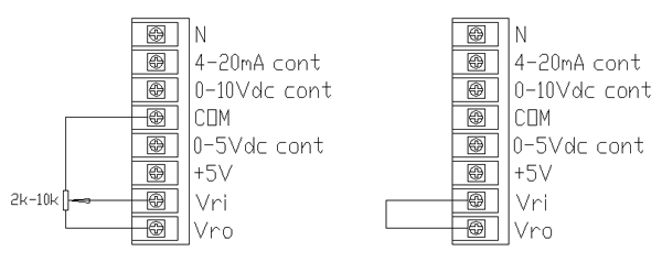 1、各控制功能端子排列如左圖,若需限幅,可接入2k-10k的電位器,其中心端接到調(diào)整器Vri端。若不需限幅,則直接將調(diào)整器Vri端與Vro端短接。