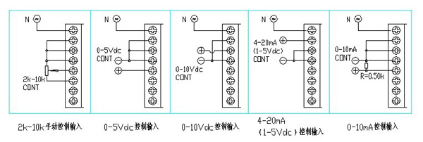 3、當(dāng)使用0-5Vdc輸入控制時,0-10Vdc和4-20mA輸入端必須接地。當(dāng)使用0-10Vdc輸入控制時,4-20mA輸入端必須接地。當(dāng)使用4-20mA輸入控制時,0-10Vdc輸入端必須接地。各CONT端相對COM端必須為正,如極性相反則輸出端可能失控。