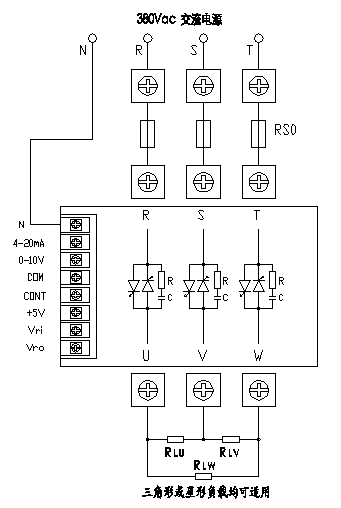 7、三相交流電路的進(jìn)線R、S、T無相序要求,N線僅為調(diào)整器內(nèi)部電源用,各輸入控制端與N線之間為全隔離絕緣設(shè)計。U、V、W三個輸出端子可接△形負(fù)載或Y形負(fù)載(無須接N線)。