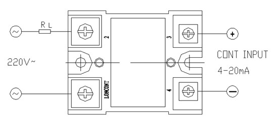 調(diào)壓器內(nèi)部①②端為可控硅電路,分為雙向可控硅普通型、單相可控硅反并增強(qiáng)型和單相可控硅半波型。其中半波型只對交流電壓的正半周調(diào)壓(模塊內(nèi)部單向可控硅的陽極接①端,陰極接②端)。③④端為4-20mA控制輸入,③端接正極,④端接負(fù)極,可以與溫控表或PLC等的4-20mA輸出控制端口匹配。調(diào)壓器輸出電壓隨著控制信號的強(qiáng)弱而線性變化。