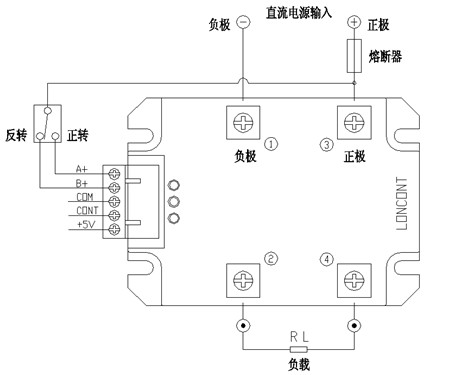 3、模塊內(nèi)A向和B向之間轉(zhuǎn)換在控制端已設(shè)置互鎖電路,有效防止正反轉(zhuǎn)開關(guān)同時(shí)導(dǎo)通。